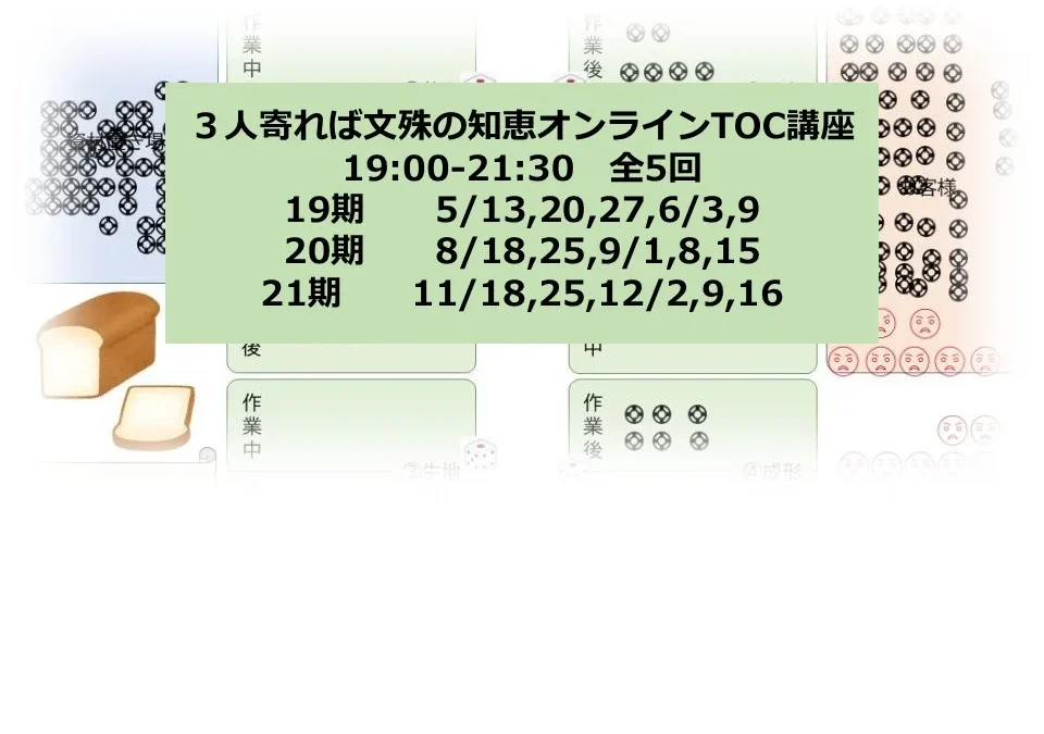 3人寄れば文殊の知恵オンラインTOC講座は、基本に忠実にシンプルでわかりやすく学べる全5回のオンライン講座です。コロナ期からはじめて、今回で19期目の開催になります。